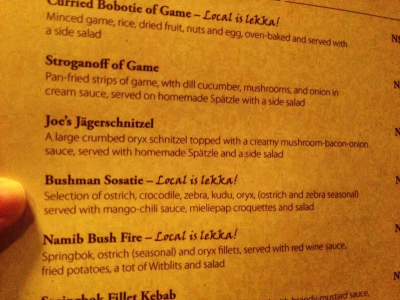 - Joe’s beer house: Excellent for game meat. The place is very turistic, but you won’t regret going there, just book before doing it. I tried the Bushman Sosatie, that as you can see in the picture below, it’s very particular