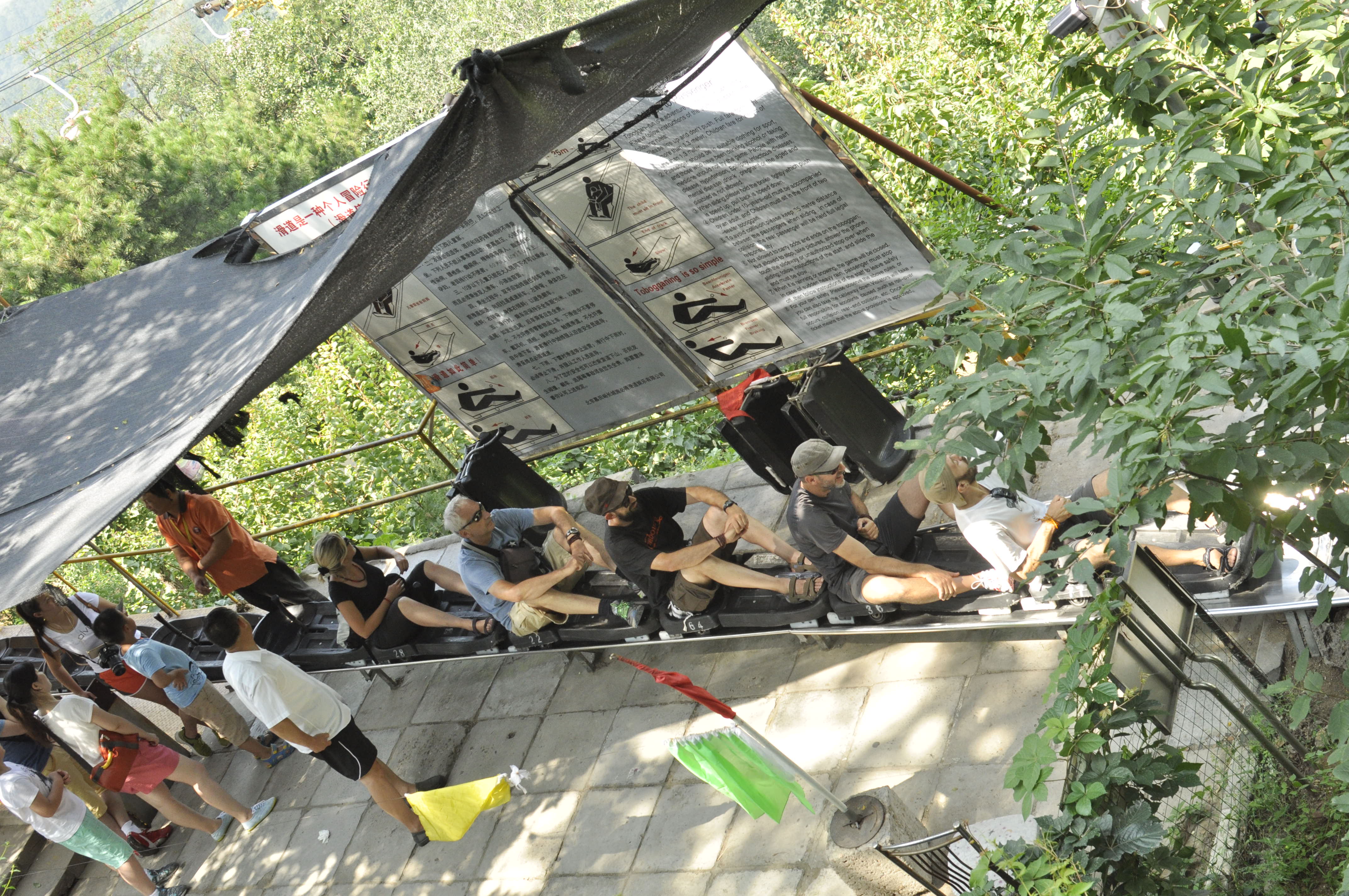 - We hire a driver to take us to the Great Wall for 1200¥ for 5 person (without tickets). It took us around 1.5 hours to get to the Mutianyu entrance from our hostel. We paid 160¥ per person for the entry, including the bus to the chair lift station, the chair lift to go up to the point 6 of the Great Wall (see map here) and then the toboggan to get back to the bus station and to our driver. We walked from point 6 to point 1 of the map. It is all full of steps and some parts are very steep. The Badaling side of the Great Wall is the most visited side and also the most preserved. Even though Mutianyu requires a little physical effort, I prefer to work out a little bit and avoid the crowd. In Mutianyu you also have the option of not taking the chair lift and walk from the bus station to the Wall. I have to say we also had a lot of fun in the toboggan