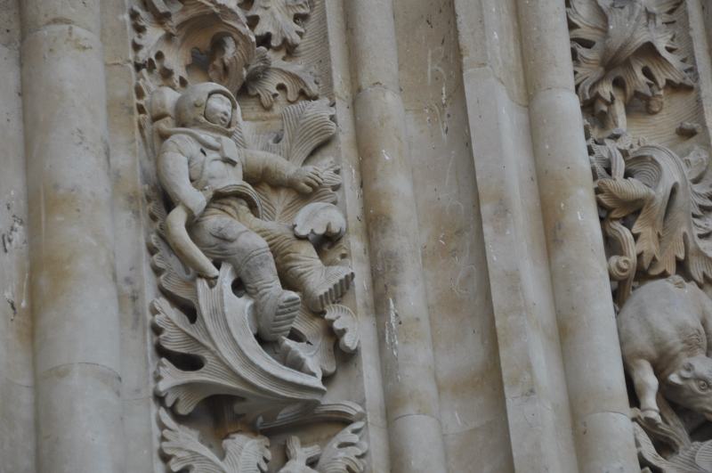 - The Old and New Cathedrals (access to the new cathedral is 4.75 euros). We identified the astronaut and Ice-cream eating Gargoyle on the facade of the new cathedral. Both are details added by the craftsmen in charge of doing some restoration work on the Cathedral in 1992. It seems it’s a regular practice of these workers to “sign” their works with some interesting details. Jerónimo García, chief restorer chose the astronaut as a symbol of the 20th century and it’s said that the gargoyle represents the students (read more here). To access the Old Cathedral you have to go trough the New Cathedral