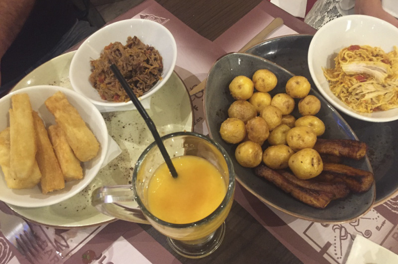 We went with friends and ordered mixed portions of cassava, shredded meat, chicken, fried plantains and Colombian potatoes, shrimp ceviche, arepas and ajiaco. Everything but the arepas (I’m Venezuelan) was amazingly good. To drink we had natural juices (mango, papaya, blackberry, passionfruit), some beers and coffee. Portions are big. We paid 25€ per person, which I think is very good for Madrid and the amount of food we had, plus the good service.