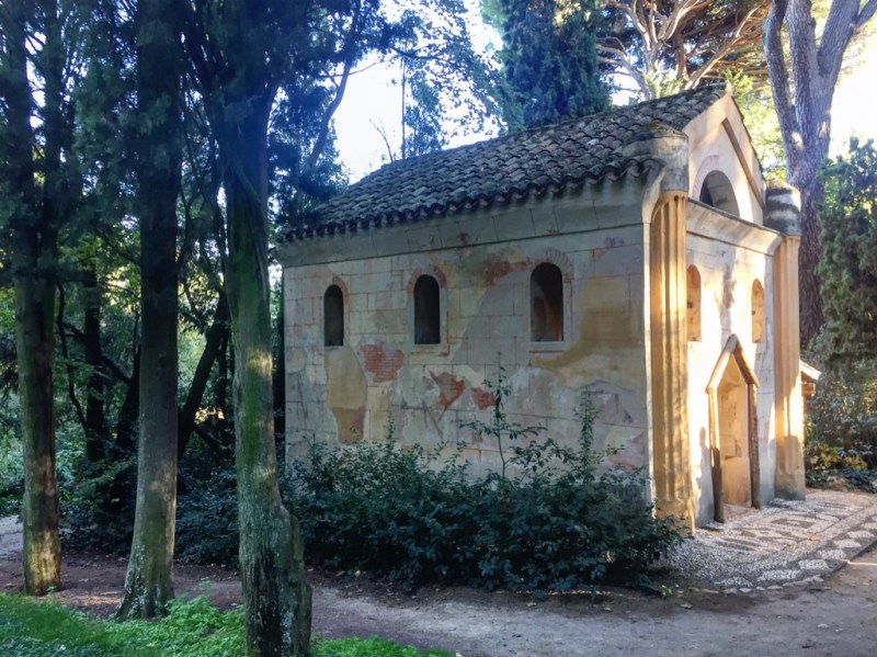 The Hermitage is one of the constructions erected with the intention of looking ruinous from the moment of its completion. It is also from the scenographer Angel María Tadey, who also places “trompe l’oeil” (trampantojos) as the bricks he paints outside the hermitage. Its black and white cobblestones also symbolize Freemasonry (it represents the duality that in the human being and the material world manifests itself as “good and evil”).